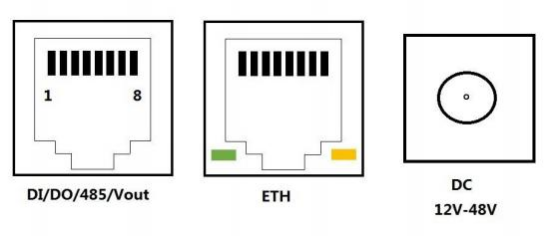 設(shè)備下方有3個(gè)接口: DI/ DO/485/Vout 接口、ETH 網(wǎng)絡(luò)通訊接口、DC12V-48V。