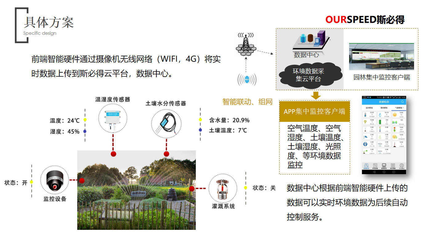園林環境及墑情監測優勢:實現管理人員對園林各個區域的環境溫度、濕度、風速、光照、土壤水分等參數進行監測;對園林綠化業務全流程進行精細化管理,對環境變化可進行認為干預,減少植物折損率;對園林噴灌用水量進行監控,為水資源利用提供有效的數據分析支持;根據土壤墑情及環境參數現狀建立用水量及灌溉方法數學模型。