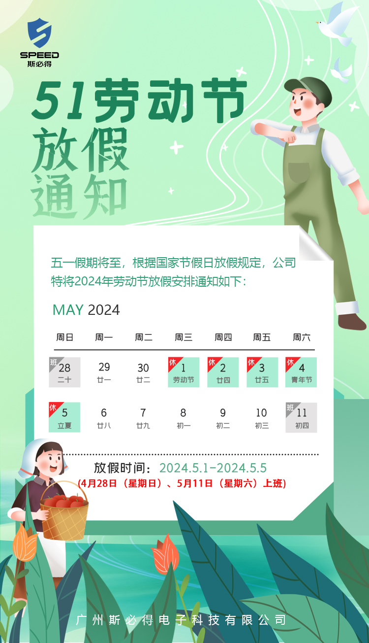 根據相關政策,結合我司實際情況,就2024年五一勞動節做調休放假安排如下,假期期間涉及項目設備的發貨、安裝、調試等事項均要提前安排,做好對接,特殊情況的需要單獨安排。