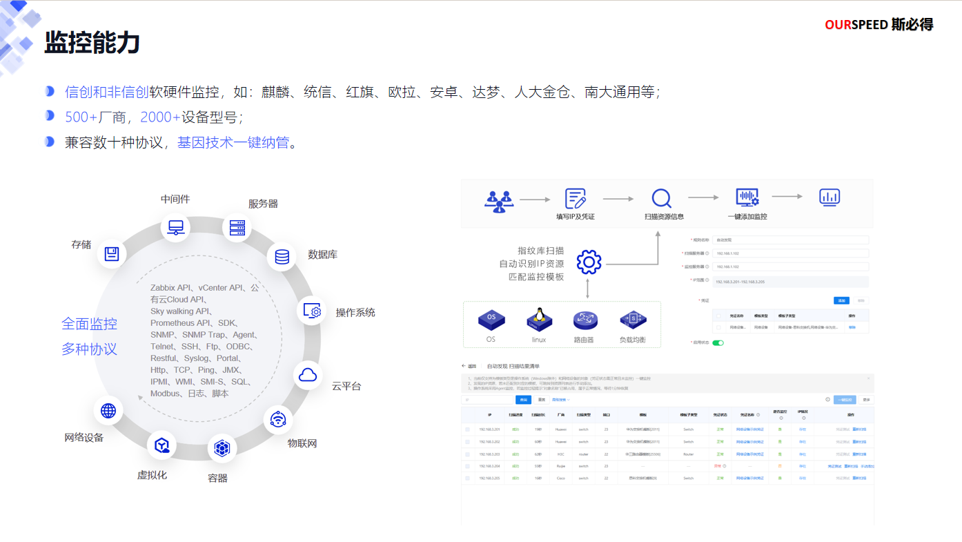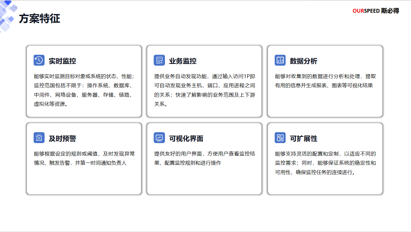 為更好的適應高速業務發展,提高日常運維效率, 提供從IT基礎硬件設施、主機系統、小型機系統、網絡設備、機房環境、虛擬化、中間件、數據庫、攝像頭到業務可用性撥測的全鏈路一站式故障預警監控、性能指標和管理平臺,能全面、快速、有效的反應當前IT基礎架構和業務系統的健康狀態,進一步降低業務宕機風險,保障各業務支撐系統可靠、穩定、高效地運行,進一步提高用戶的滿意度和忠誠度,全面提升服務質量。