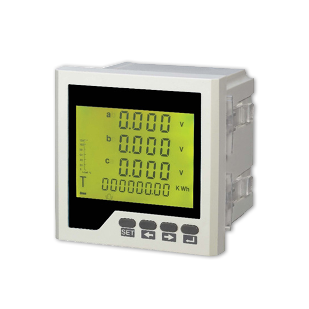 三相多功能電量儀 用于檢測機房供電的三相電參數(比如各相電壓、電流、功率、頻率等參數),每個儀表的大小為96*96*96mm, 一般放置在電箱里。一般將機房供電的三相三線或者三相四線連接到儀表的前面接頭,儀表輸出信號為RS485數據通訊(二芯,雙絞線連接至RS485總線上)。